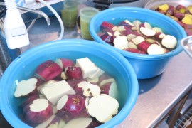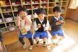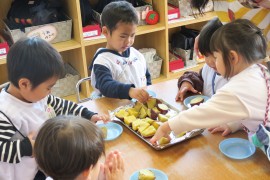 写真ギャラリー おいもを食べよう 2021年11月19日(金) 先日青組さんが掘ってくれたおいも。参観日の日には保護者の方にも見ていただいたかと思います。陰干ししてから、より甘くなるように時間をおいて、今日ついに蒸かし芋にしていただきました。わかば組・赤組さんはおやつとして、黄組・青組さんはお昼ごはんの一品として食べました。しっかり甘みがあって、とても美味しいおいもでしたよ。青組さんは特に、自分たちが掘ったおいもということで格別のおいしさだったそうです。 もどる