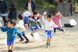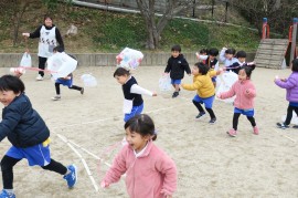 写真ギャラリー お正月と言えばその2 2021年12月21日(火) さて、今日は赤組さんのお正月遊びです。赤組さんはビニール袋に絵を描いて、それに紐をつけた“凧”を作りました。みんな一生懸命走ってくれるのですが、先生から「飛んでるよ!飛んでるよ!」と声をかけられて、『えっホント!?』と振り返ると凧が落ちてしまう、といった状態で、自分の凧が飛んでいるところはなかなか見られなかったようです。それでも“子どもは風の子”の言葉通りに、寒さを感じさせないほど元気に楽しんでくれました。 もどる