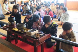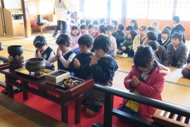 写真ギャラリー 3学期が始まりました 2022年1月7日(金) 今日から3学期のスタートです。全体で始業式をした後、青組さんだけお寺の本堂で“仏様とお話”をしました。4月からは小学生になる青組さん。期待に満ち溢れる反面、不安を抱えている子ももちろんいます。そんな中で“○○を頑張るぞ!”“◇◇できるようになりたいな”という思いを、手を合わせて静かに目をつぶって、仏様に伝えてもらいました。小学校入学に向けて、残り3か月の幼稚園生活を存分に楽しみ、そしてしっかり成長していってほしいですね。 もどる