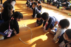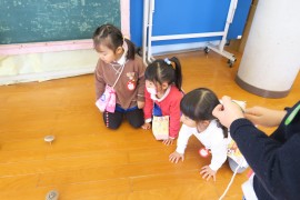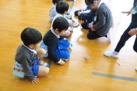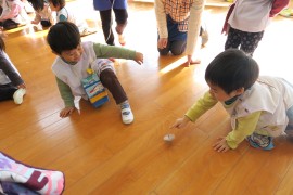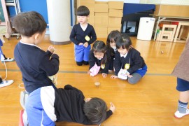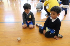 写真ギャラリー コマ回し大会 2022年1月24日(月) 今日はコマ回し大会の日でした。12月中から青組さんが頑張ってきたコマ回しを、みんなの前で披露してくれました。黄組さんも赤組さんもわかば組さんも興味津々の様子で、くるくる回るコマを見つめていました。コマ回しを披露した後は、青組さんだけで『コマの卒業試験』をしました。無事に全員が合格することができ、ご褒美の金ぴかシールと賞状をもらって嬉しそうでしたよ。 もどる