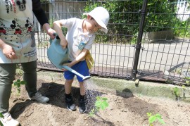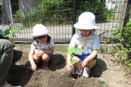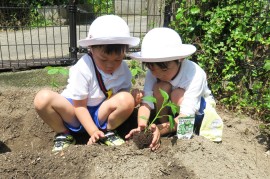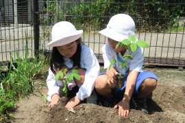 早くも夏が感じられた今日、青組さんが畑に野菜を植えました。