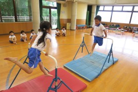 跳び箱3段を跳ぶことと、鉄棒の前回りをすることが最終目標です。