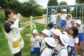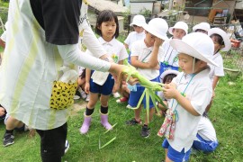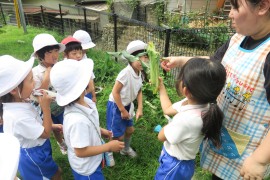 写真ギャラリー 夏野菜~青組~ 2023年7月19日(水) 青組さんの畑で作っていた夏野菜が収穫できました。先週に枝豆とピーマンを、そして今日とうもろこしを収穫しました。「とうもろこしの取り方、知ってる?」と聞いてみると、「トトロみたいに“パキッ”てやる!」と答えが返って来て、なかなか上手に収穫してくれました。収穫した夏野菜は冷蔵庫で保存して、来週のお泊り会で食べれたらいいなと思っています。 もどる