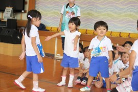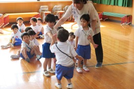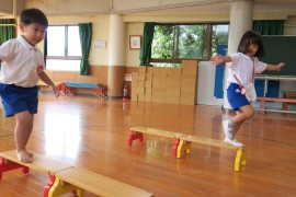 ここまでの幼稚園生活で、並ぶこと・待つことはすでにある程度身に付いているので、今日は“タッチ交代”をテーマにして、平均台渡りを楽しみました。