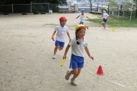 黄組までの“かけっこ”は『先生の合図』でスタートしていましたが、“リレー”は『バトンが来たら走る』ことになります。