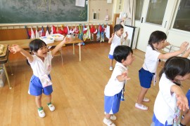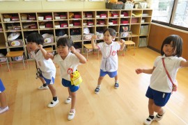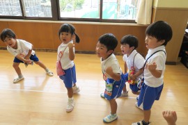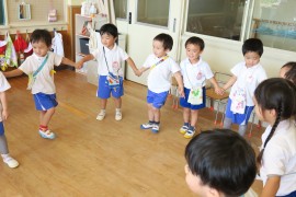 写真ギャラリー 赤組の踊り~お遊び大会~ 2023年10月2日(月) お遊び大会では赤組さんも踊りを披露してくれます。今年は残暑が厳しかったので、赤組さんの体力を考慮して、9月中は踊りの活動もお部屋でやりました。お部屋で踊るといささか狭いのですが、子どもたちは元気いっぱいに体を動かしています。みんな踊りの曲を気に入ってくれたようで、楽しそうに笑顔が溢れています。10月に入ってようやく日中も過ごしやすくなってきましたので、そろそろお外でも踊ってみたいと思います。 もどる