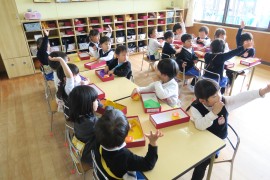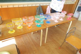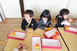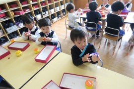 写真ギャラリー もも組のフルーツパフェ~作品展~ 2023年11月20日(月) お遊び大会でもも組さんは『キラリン☆フルーツパフェ』を踊りましたね。それにちなんで、今日はもも組さんはフルーツパフェを作りました。カラフルな器に入れるフルーツを、紙を丸めて作ります。美味しそうなフルーツパフェが出来るかな? もどる