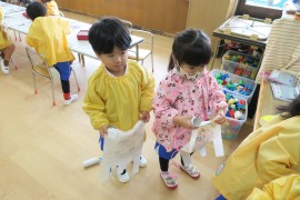 と考えてもらい、ビニール袋とペーパー芯でオリジナルの凧を作りました。