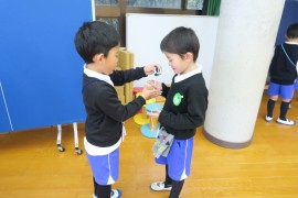 写真ギャラリー コマ回し大会に向けて~青組~ 2024年1月19日(金) いよいよ来週の金曜日はコマ回し大会です。コツをつかんで回せるようになった子も増えてきて、キノコ回しや股抜き投げなど、新しい技にチャレンジしています。また、友だち同士お互いにアドバイスし合ったりする微笑ましい姿も見られます。今日はコマを持って帰っているので、この週末、お家でも取り組んでみてくださいね。 もどる