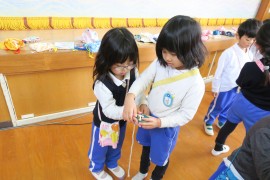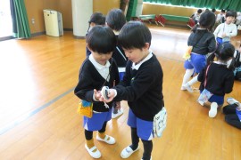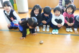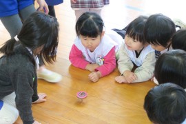 全員でお遊戯室に集まって、青組さんが回すコマを見ました。