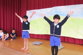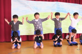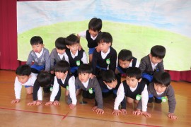写真ギャラリー オリンピック体操~お遊戯会~ 2024年2月14日(水) お遊戯会では、青組の男の子の伝統の演目『オリンピック体操』があります。本番では音楽に合わせて、次々と体操を披露していくのですが、まだ活動も初期段階ということで、音楽はかけずに、一つひとつの動きを確認しながらです。音楽に合わせること、メリハリをつけた動きをすること、などなど大切なことはたくさんありますが、何よりも重要なのはケガをしてしまわないことです。焦らずに無理のないように進めていきたいと思います。 もどる