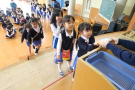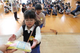そして最後に、青組さんが卒園証書をもらったみたいに舞台に上がって、ご褒美のお菓子をもらいました。