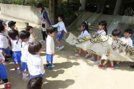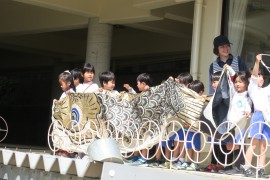 この大きな鯉も昔は“鯉のぼり”として空を泳いだのですが、今の園庭の支柱では長さが足りず、泳げなくなってしまいました。