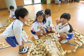 昨日の雨の影響で園庭がまだ乾いていなかったので、今日は青組さんがお遊戯室で積み木を使って遊びました。