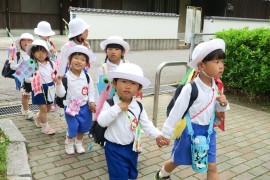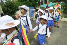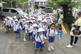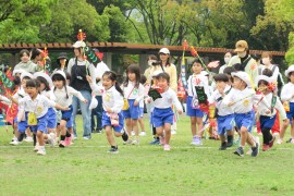 子どもたちはポポロまで、赤組さんは青組さんと、黄組さんは黄組さん同士で手をつないで、しっかり歩いて来てくれました。