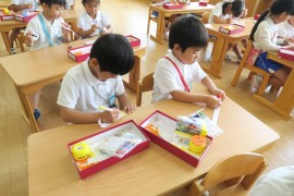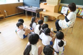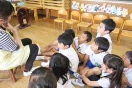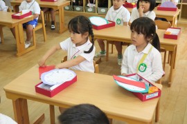 普段、保育室で目にする「壁掛け時計」の他にどんな時計があるかな?と考えたり、よく動く針(秒針)が一周するまでに何回動くかな?と数えたりして、“時間”というものに触れました。