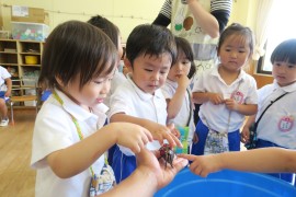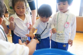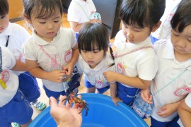 カニは大きなハサミを持っているので、最初は『興味』よりも『怖さ』が勝っていたようでしたが、一人が“ちょん”と触ってみて、大丈夫なことが分かると、『興味』が『怖さ』をあっという間に追い越して、みんな次々に“ちょん、ちょん”と触り出しました。