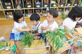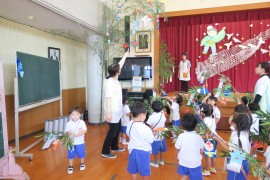 写真ギャラリー 明日は七夕会 2024年7月5日(金) いよいよ明日は七夕会の本番です。今日は七夕のお願い事を着けた笹飾りを作ったり、七夕会の“ご褒美”の話を聞いたりしました。例年、梅雨の影響もあって七夕会の日に晴れることはめったにないのですが、今年は晴天の予報となっています。かなり暑くなりそうな上に、幼稚園にたどり着くまでには厳しい坂もあるので、保護者のみなさまも気持ちを強く持ってお越しくださいね。 もどる