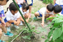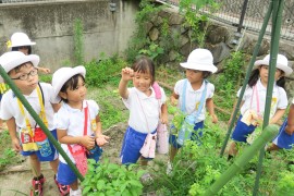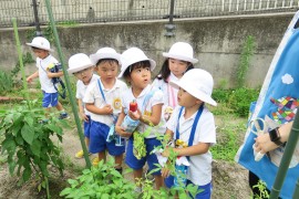 たんぽぽ組さんがパプリカを、すみれ組さんがオクラを収穫しました。