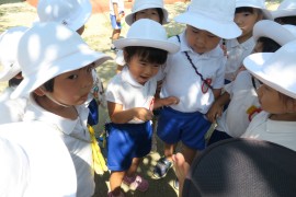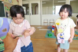 黄組さんはちょっと触ったり持ったりできる子もいましたが、赤組さんやわかば組さんは大きな声で鳴くセミにおっかなびっくりで、慌てて逃げだす子もいました。