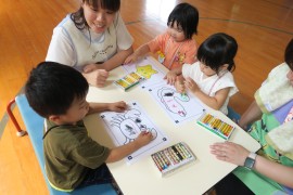 黄組は色を探して写真を撮って白紙のステンドガラス状の絵を塗っていく『とりえ』を、