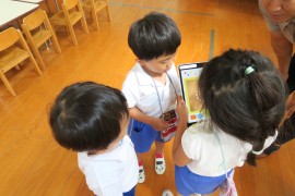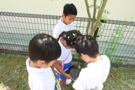 園の環境的にも方針的にも、保育においてタブレットを子どもに持たせるイメージは全くと言っていいほどなかったのですが、「わくわくスコープ」で、セミや木やバラのとげを拡大してみようとする子どもたちの姿を見ると、これはこれで自然環境を生かす手段なのかなとも感じました。