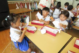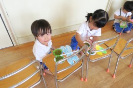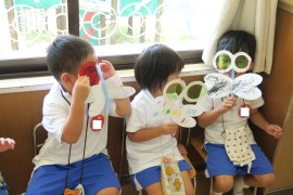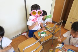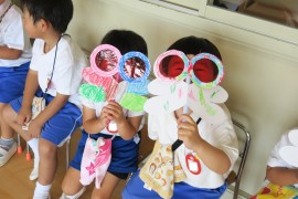 写真ギャラリー トンボのメガネ~赤組~ 2024年9月5日(木) まだまだ日中は猛烈に暑いですが、朝晩は幾分過ごしやすくなり、“秋”の訪れを感じますね。赤組さんがトンボの制作をしました。線に沿って『トンボのメガネ』の丸をハサミで切って、色を塗って完成させました。それぞれに思い思いの色の『メガネ』を選んで、 「先生が赤く見えるー!」 「ぼくは緑よー」と、いつもとは違った色の景色を楽しんでいました。 もどる