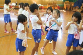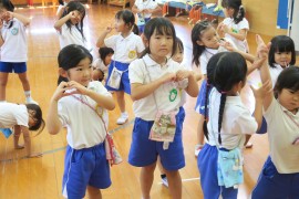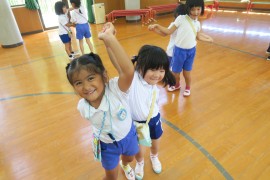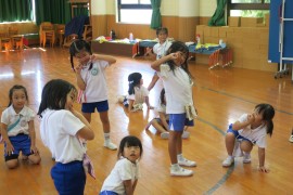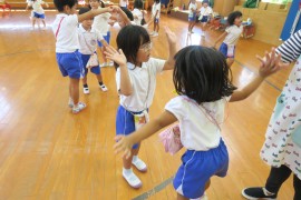 写真ギャラリー 黄組・青組の女の子の踊り 2024年9月20日(金) お遊び大会では、黄組と青組の女の子で異年齢の踊りをします。それぞれペアになる子と顔合わせして、みんなで曲を決めて、これから振り付けを考えていくところです。異年齢のペアとはいえ、キッズだったり登降園のバスだったりで、顔見知りの子も多いので、すぐに打ち解けたようで楽しそうな笑顔が見られます。青組さんは黄組さんを優しくリードして、黄組さんは青組さんにあこがれを持ってついていき、素敵な踊りを完成させてほしいですね。 もどる