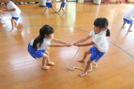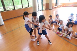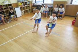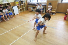 最初は後ろに向かって“歩こう”とする子が多かったですが、強く引っ張るためには、足を踏ん張りつつ後ろに体重を乗せることが必要です。