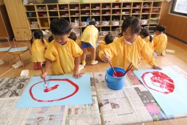 赤組は絵の具で大玉を描いて、後でそれを押す自分を描きます。