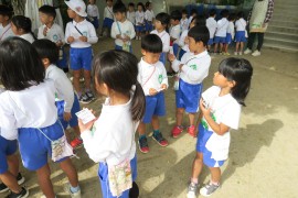字が読める子、まだ読めない子と様々ですが、名札と見比べたりして無事に3人組を作ることができました。