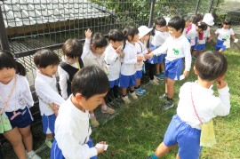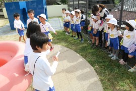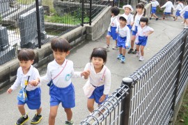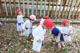 3人組での“遠足ごっこ”の後に、赤組さんは西町第2公園から西宮神社の裏手まで、秋探しの探検に行きました。