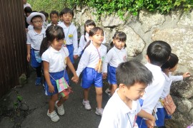今日は青組・黄組・赤組の3人組を作って、園周辺を散歩する“遠足ごっこ”をしました。