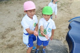 他の園さんも来ておられていて、人だかりができていたので「何かな?」と思って近づいてみると、カマキリでした。