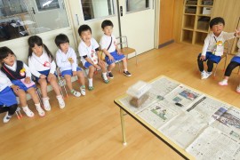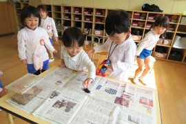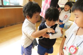 写真ギャラリー 作品展への取り組み~さくら組クワガタ~ 2024年11月12日(火) さくら組さんがクワガタと触れ合いました。担任の先生のお家で育てている立派なクワガタです。最初はおっかなびっくりの子もいましたが、さすがは虫が大好きな月見っ子で、次々と触り出して、手や腕に乗っけてしっかりと触れ合うことができました。 もどる